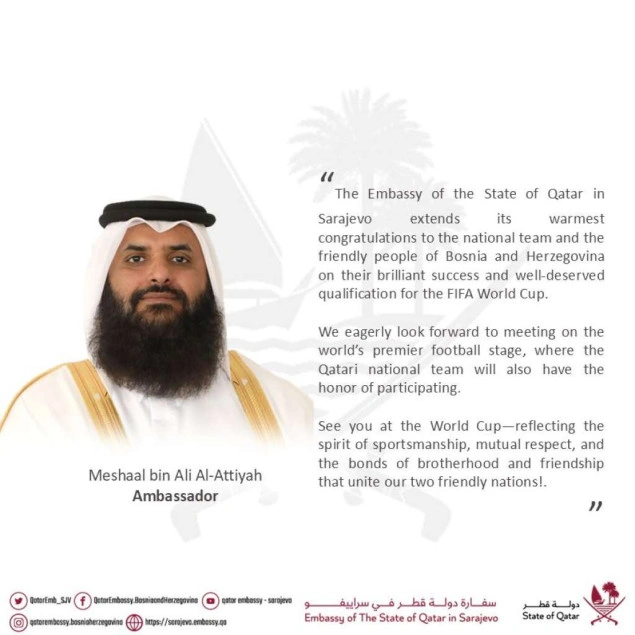 – Ambasadi Države Katar, a posebno meni lično, predstavlja veliko zadovoljstvo da Vam uputim najiskrenije čestitke povodom historijske pobjede koju je nacionalna reprezentacija Bosne i Hercegovine ostvarila u odlučujućoj utakmici protiv reprezentacije Italije te zasluženog plasmana na Svjetsko prvenstvo u fudbalu 2026. godine. Ovo veliko sportsko dostignuće nije samo izvor ponosa i radosti za narod Bosne i Hercegovine već je i snažna poruka nade i inspiracije, koja odražava duh upornosti i odlučnosti po kojima je Vaša prijateljska zemlja prepoznatljiva. Dijelimo s Vama radost ovog uspjeha i želimo nacionalnoj reprezentaciji još više uspjeha i sjaja na predstojećem prvenstvu, a Bosni i Hercegovini trajni napredak i prosperitet – naveo je u čestitkama ambasador Meshaal bin Ali Al-Attiyah.