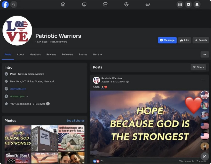 Nedavna objava na kanadskoj stranici American Patriots sadržala je vještački generisanu sliku američkog vojnika i njegove djece te dobila više od 100.000 lajkova i 35.000 komentara. Pomenuta stranica, kao i većina drugih, preusmjerava korisnike Facebooka na web stranice s nekvalitetnim člancima.