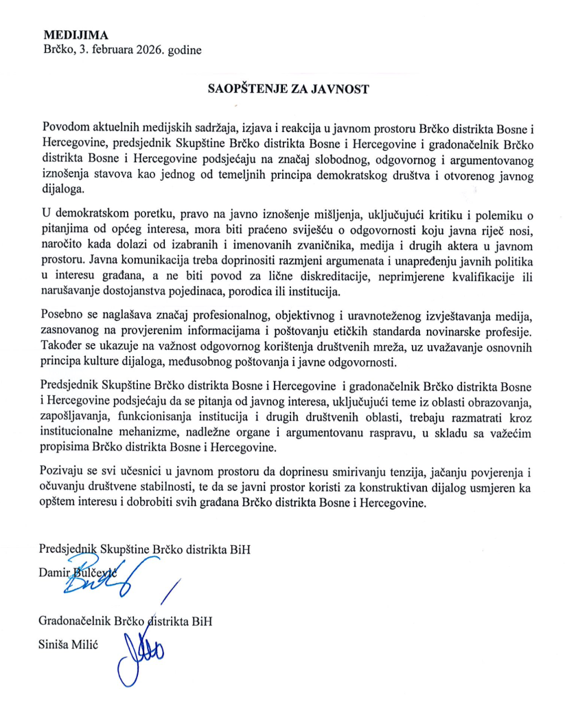 Kao političko nezavisni medij posvećen javnom interesu, smatramo važnim da se povodom posljednjeg saopštenja institucija Brčko distrikta BiH podsjeti na osnovne standarde slobode medija i javne komunikacije u demokratskom društvu.