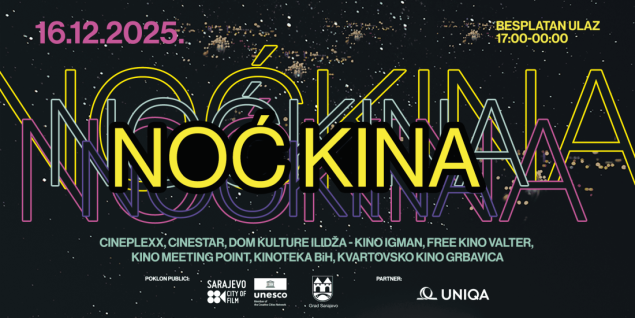 Noć kina bit će održana u utorak, 16. decembra, a besplatan ulaz u kina građanima i turistima Sarajeva omogućili su Sarajevo grad filma UNESCO-a i Grad Sarajevo. Partner projekta je UNIQA osiguranje.