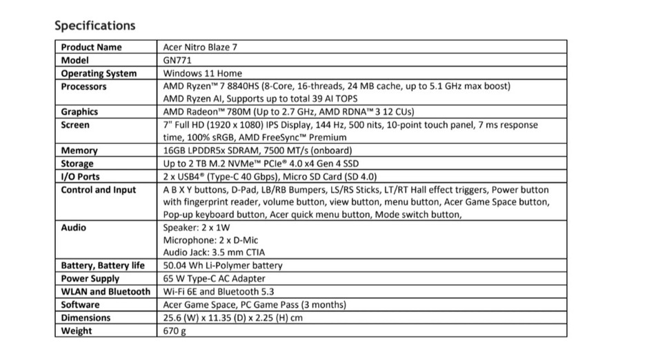 Acerov uređaj izgleda kao nešto između prošlogodišnjeg modela Asus ROG Ally i novijeg ROG Ally X. Nitro Blaze kao i ROG Ally ima 7-inčni IPS ekran rezolucije 1.080p s varijabilnom frekvencijom osvježavanja od 144 Hz.