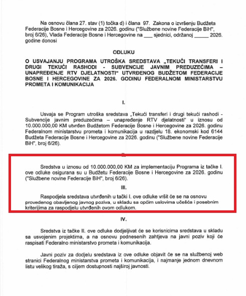 “Javni poziv za dodjelu sredstava iz ove odluke objavit će na službenoj web stranici Federalnog ministarstva prometa i komunikacija, i najmanje jednom dnevnom listu velikog tiraža, s ciljem dostupnosti najširoj javnosti. Korisnici transfera iz tačke l. ove odluke su javna poduzeća registrirana za pružanje RTV u Federaciji Bosne i Hercegovine. Svrha predmetnog transfera je unapređenje RTV djelatnosti”, stoji u tekstu Odluke koju je usvojila federalna Vlada.