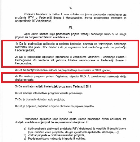 A ti uslovi su, između ostalih: “da je podnosilac aplikacije u registru korisnika dozvola za televizijsko emitiranje razvrstan kao javni RTV emiter i da je registriran kod nadležnog suda na području Federacije”; da je u pitanju “preduzeće u većinskom vlasništvu Federacije Bosne i Hercegovine i/ili kantona i/ili jedinica lokalne samouprave u Federaciji Bosne i Hercegovine”, te da “emituje program putem Digitalnog signala A, pokrivenost najmanje dvije digitalne regije”.