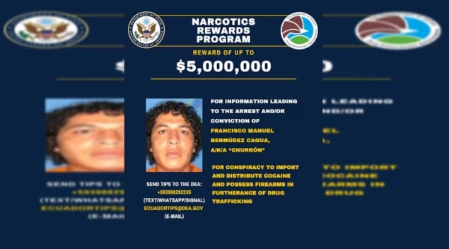 Sjedinjene Američke Države (SAD) u četvrtak su objavile nagradu do pet miliona dolara za informacije koje bi dovele do hapšenja ili osude odbjeglog Francisca Manuela Bermudeza Cague, visokog vođe ekvadorske organizacije Los Choneros.