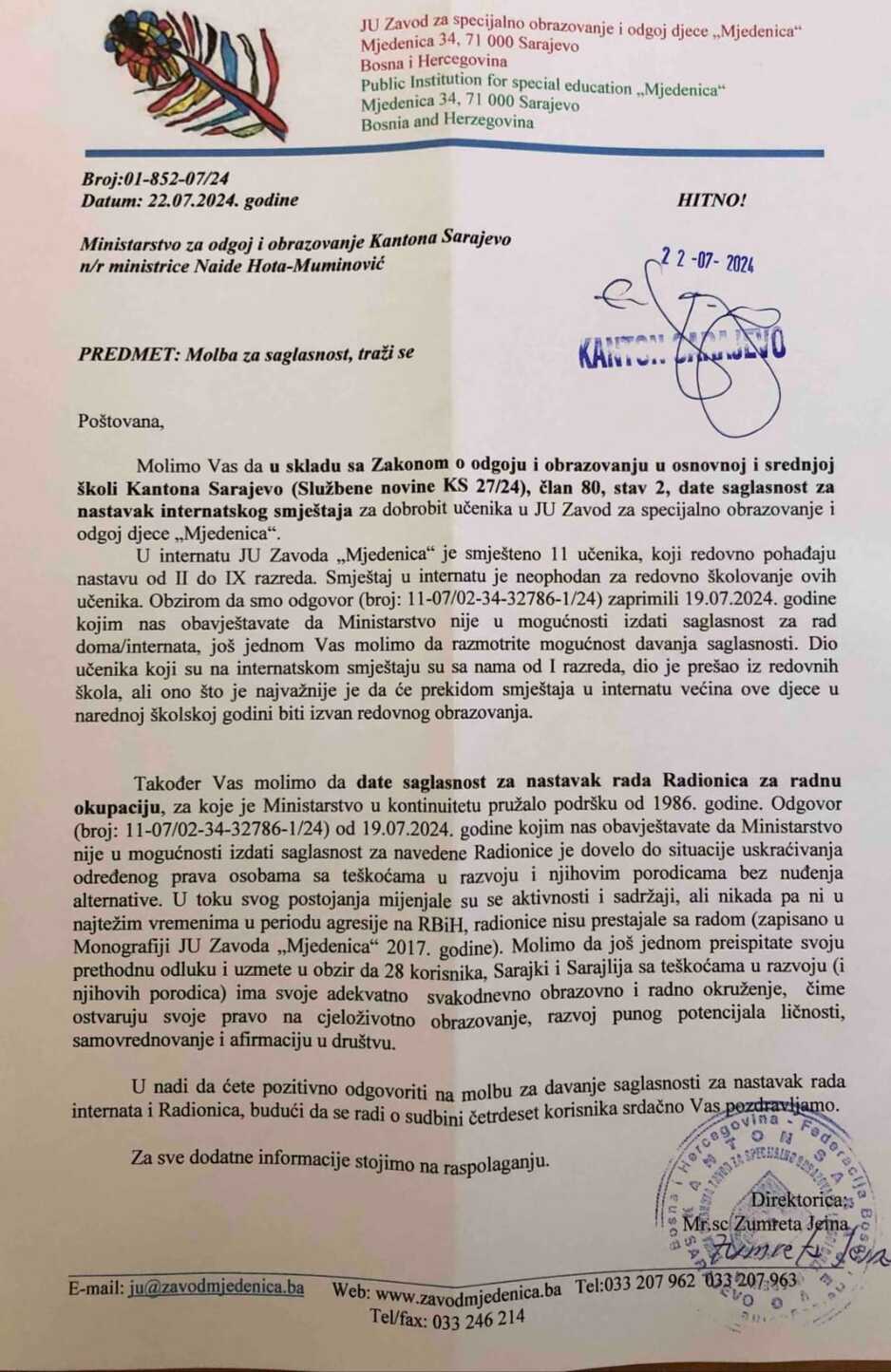 Jeina je zatražila da Zavod Mjedenica dobije potrebnu saglasnist za nastavak inernatskog smještaja, a što je u interesu i dobrobiti učenika.