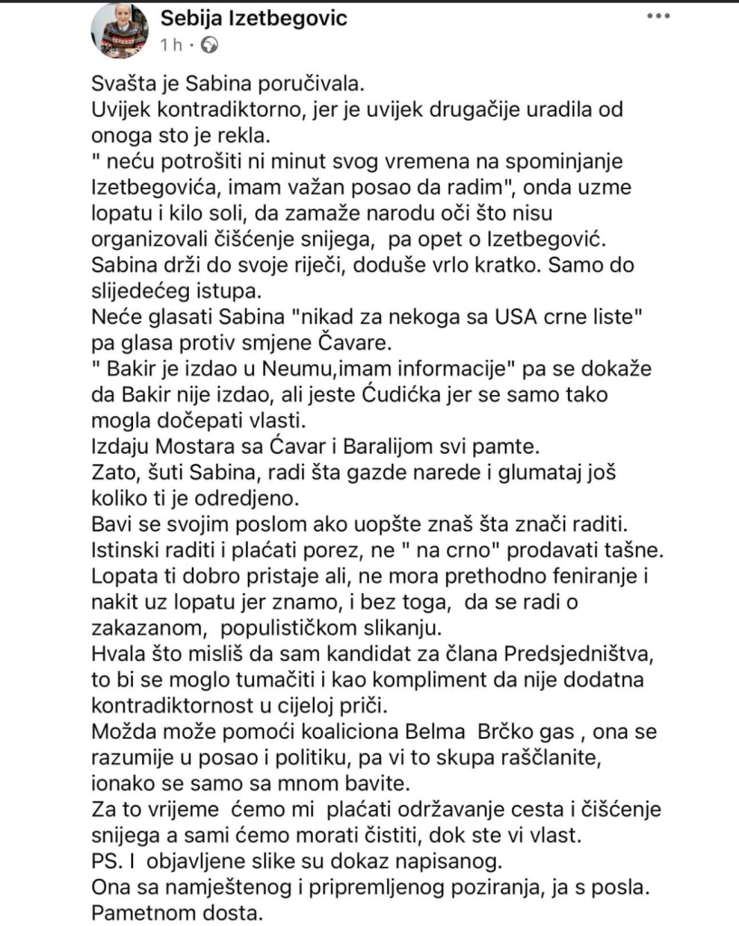 U završnici statusa Izetbegović navodi da bi “možda mogla pomoći koaliciona Belma Brčko gas”, uz poruku da se ta osoba “razumije u posao i politiku”, te da bi “vi to skupa raščlanili”. Upravo taj dio objave izazvao je nagađanja o tome na koga se “Belma” odnosi i kakvu vezu ima s infrastrukturnim i energetskim projektima, posebno u Brčko distriktu.