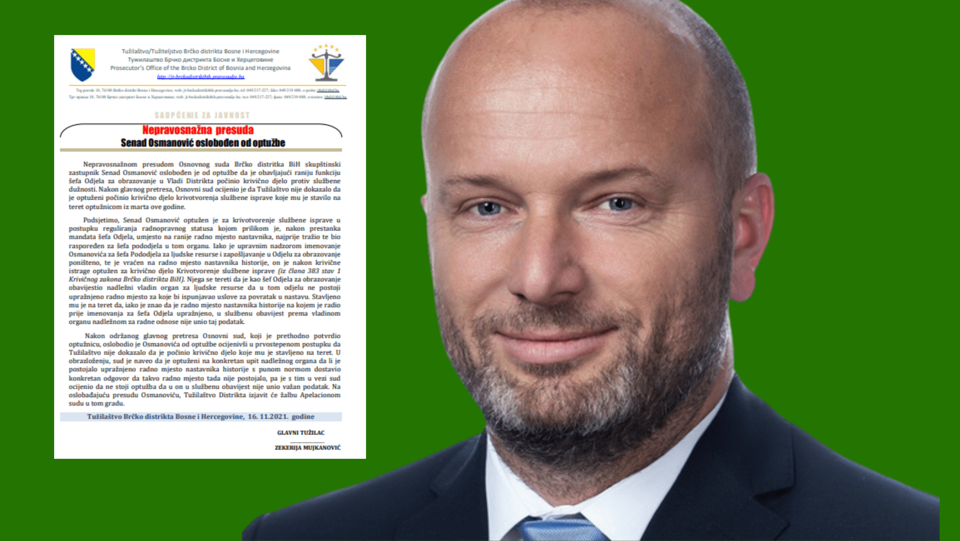 Nepravosnažnom presudom Osnovnog suda Brčko distritka BiH skupštinski zastupnik Senad Osmanović oslobođen je od optužbe da je obavljajući raniju funkciju šefa Odjela za obrazovanje u Vladi Distrikta počinio krivično djelo protiv službene dužnosti. Nakon glavnog pretresa, Osnovni sud ocijenio je da Tužilaštvo nije dokazalo da je optuženi počinio krivično djelo krivotvorenja službene isprave koje mu je stavilo na teret optužnicom iz marta ove godine.