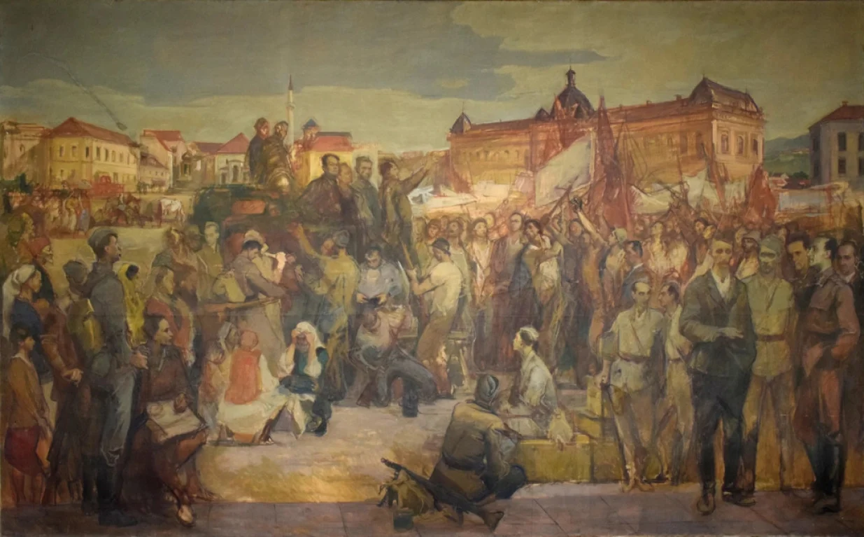 Prema kustosu i umjetniku Andreju Mirčevu, izložba se konceptualno temelji na tri povezana elementa: tridesetoj godišnjici Dejtonskog sporazuma, Benjaminovoj knjizi “Porijeklo njemačke žalobne igre” i Mujezinovićevoj slici “Oslobođenje Tuzle”. U njihovom spoju nastaje kritički prostor u kojem se isprepliću politika, filozofija i umjetnost, gdje se iznalaze vlastita učila u potrazi za zajedništvom, što je polazište za proces prelaska iz pukog učenja u emancipatorsko stvaranje. Glavnina zajedničkog rada realizirana je u Međunarodnom ateljeu “Ismet Mujezinović” u Tuzli, gdje su učenici radili neposredno pred slikom “Oslobođenje Tuzle” 1943. (platno 3,4 x 5,5 m). Ovaj monumentalni, ali nedovršeni prikaz trenutka oslobođenja grada od fašizma poslužio je kao pedagoški i simbolički alat – kao slika borbe, a ne trijumfa, i kao metafora za Bosnu i Hercegovinu danas: nedovršenu, ali s potencijalom oslobađanja. Mirčev interpretira izložbu kao dijalektički pejzaž, u kojem se povijest prikazuje fragmentarno, alegorijski i montažno. Koncept alegorije Waltera Benjamina omogućava da se povijest čita kao ruševina i mogućnost obnove istovremeno, dok umjetnost postaje prostor političkog iskustva i samoafirmacije. Vodeći se time, proces nastanka izložbe “Odučavanje od Daytona” prerastao je u svojevrsnim teatar oslobođenja: mjesto gdje su mladi – kroz stvaranje – propitivali logiku vlasti i društvene pasivnosti, afirmišući mogućnost drugačijeg, solidarnijeg svijeta.