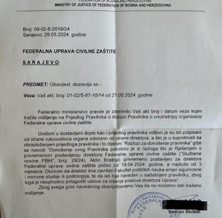 “Uvidom u dostavljeni dopis kao prijedlog pravilnika vidljivo je da su isti potpisani od strane rukovodioca organa odnosno od strane direktora, a što je u suprotnosti sa obrazloženjem prijedloga pravilnika i to dijelom ‘Razlozi za donošenje pravilnika’ gdje se navodi ‘Donošenje ovog Pravilnika potrebno je iz razloga što je Rješenjem o privremenom postavljanju direktora Federalne uprave civilne zaštite, Aldin Brašnjić privremeno postavljen za direktora Federalne uprave civilne zaštite počev od 18.04.2024. godine, a najduže do 3 mjeseca. Obzirom da direktor ima završen Fakultet političkih nauka – smjer sigurnosne i mirovne studije ili politologija, te da isti nije naveden u sadašnjem pravilniku, zbog toga je neophodno prilagoditi uslove za vršenje poslova direktora Uprave’. Zbog svega gore navedenog obaviještavamo Vas da ne možemo dati traženo mišljenje”, napisao je Škobić u dopisu od 29.05.2024. godine.