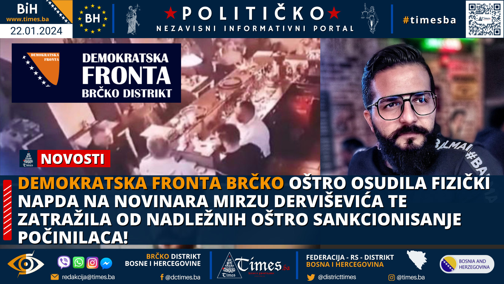 -Kategorično osuđujemo napad na novinara Mirzu Derviševića, vlasnika i urednika brčanskog portala Times.ba od strane poznatih počinilaca