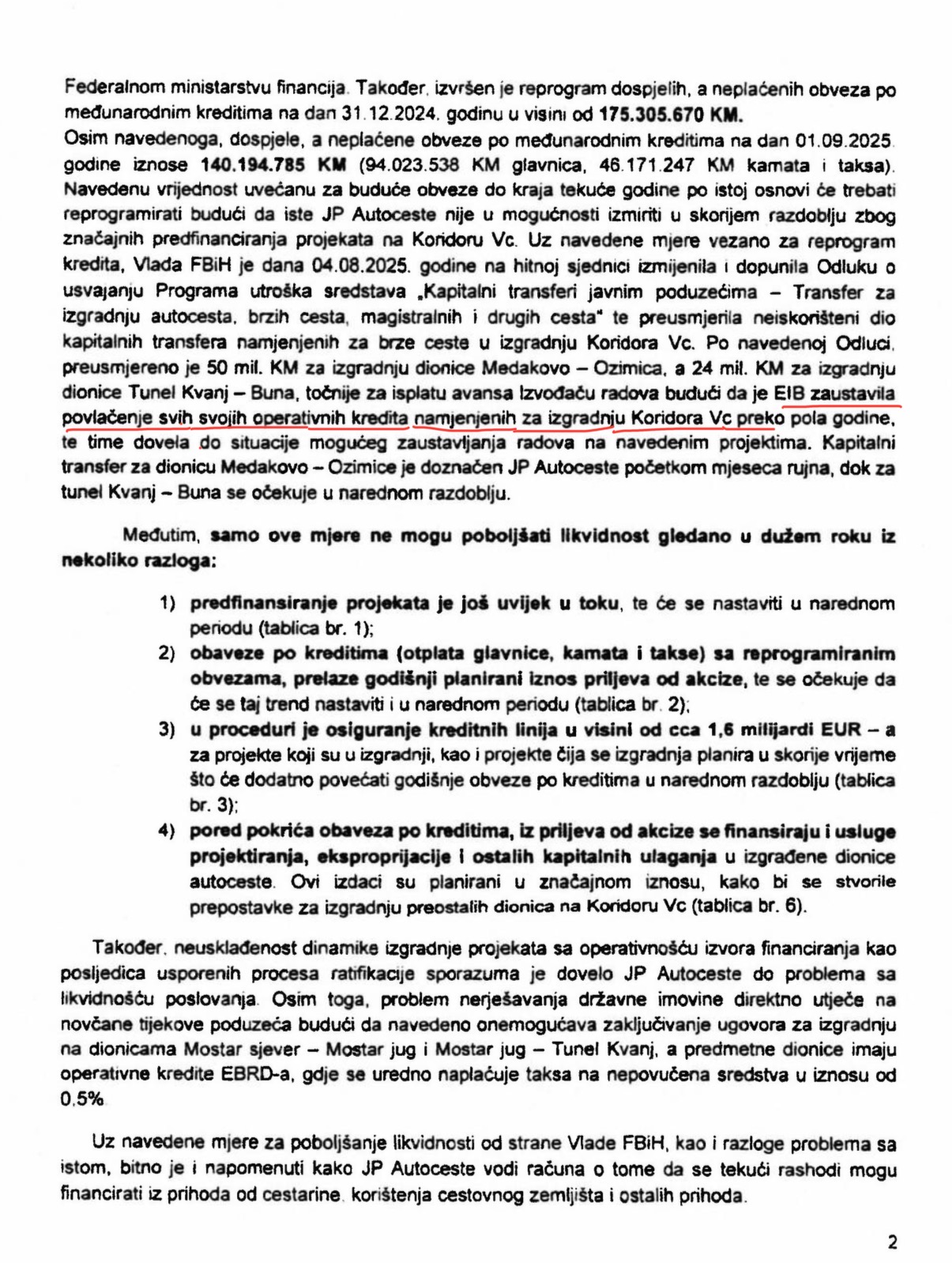 “Dospjele, a neplaćene obaveze po međunarodnim kreditima na dan 1.9.2025. godine iznose 140 miliona maraka. Navedenu vrijednost uvećanu za buduće obaveze do kraja tekuće godine po istoj osnovi će trebati reprogramirati, budući da iste JP Autoceste nije u mogućnosti izmiriti u skorijem razdoblju zbog značajnih predfinanciranja projekata na Vc. Vlada FBiH je dana 4. avgusta 2025. godine na hitnoj sjednici izmijenila i dopunila odluku o usvajanju programa utroška sredstava. Po navedenoj Odluci preusmjereno je 50 miliona maraka za izgradnju dionice Medakovo- Ozimica, a 24 miliona za izgradnju dionice Tunel Kvanj-Buna, tačnije za isplatu avansa izvođaču radova budući da je EIB zaustavila povlačenje svih svojih operativnih kredita namijenjenih za izgradnju Koridora Vc preko pola godine, te time dovela do situacije mogućeg zaustavljanja radova na navedenim projektima. Kapitalni transfer za dionicu Medakovo-Ozimice je doznačen JP Autoceste početkom mjeseca rujna, dok za tunel Kvanj.Buna se očekuje u narednom razdoblju.