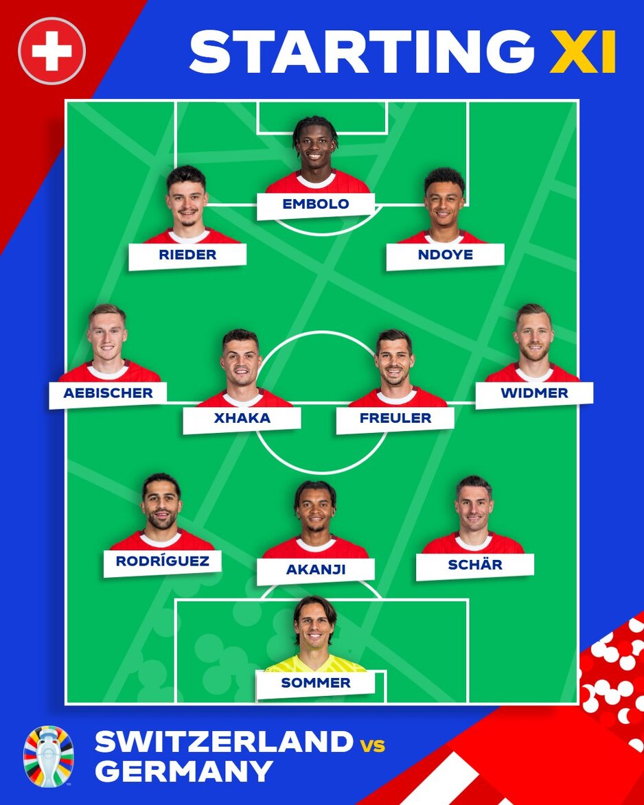 Švicarska će protiv Njemačke igrati u formaciji 3-4-2-1. U prvom timu su: Sommer, Rodriguez, Akanji, Schar, Aebischer, Xhaka, Freuler, Widmer, Rieder, Ndoye i Embolo.