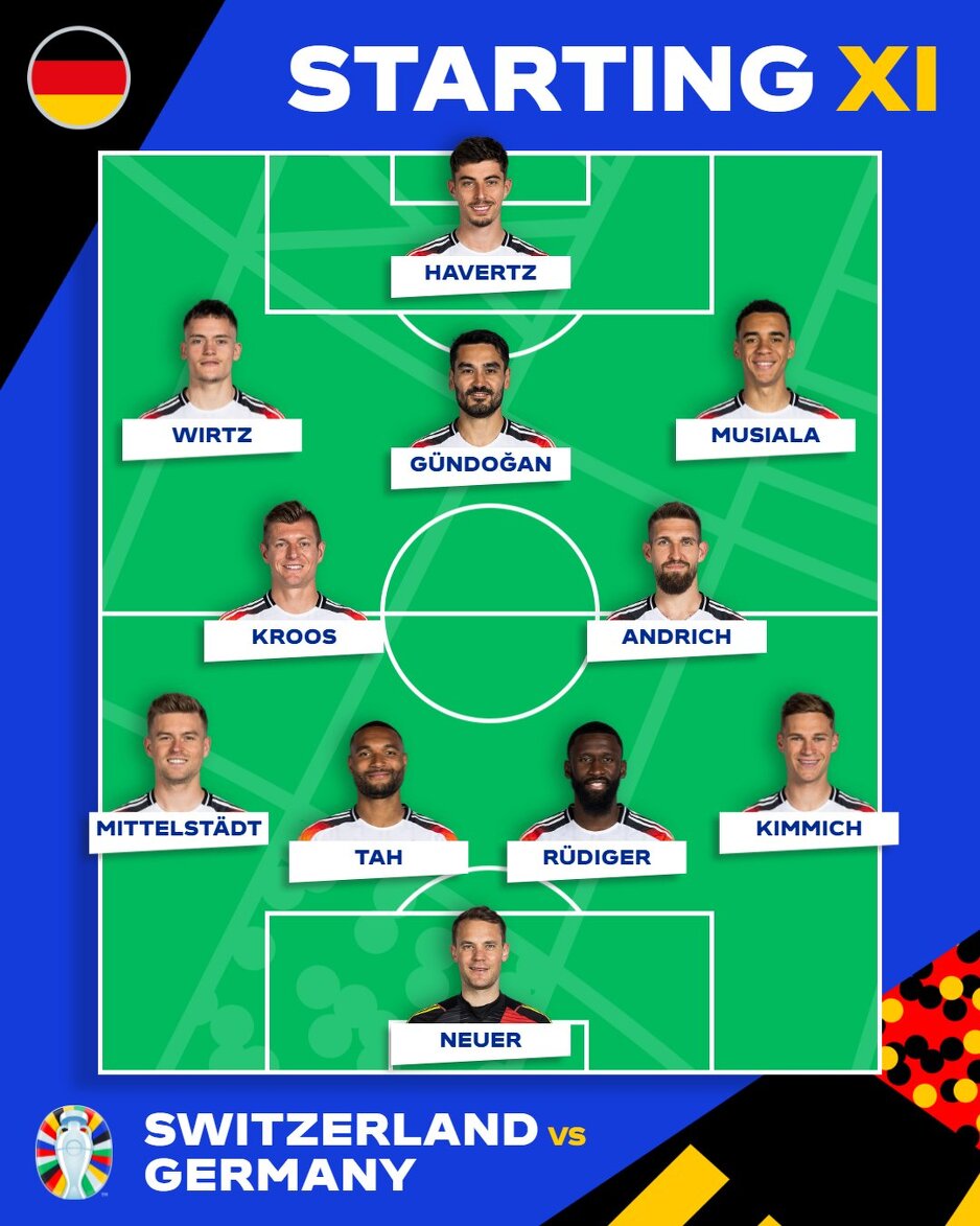 Domaćin prvenstva će odgovoriti u formaciji 4-2-3-1, a od prve minute igrat će: Neuer, Mittelstadt, Tah, Rudiger, Kimmich, Kroos, Andrich, Wirtz, Gundogan, Musiala i Havertz.