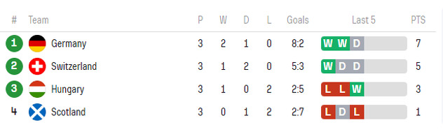 20:45 – Duel Škotske i Mađarske je praktično dvoboj za treće mjesto. Škotska bi pobjedom vjerovatno i izborila osminu finala budući da već ima jedan osvojen bod, dok su Mađarima osim eventualne pobjede potrebni i dobri rezultati iz drugih grupa da bi kao jedan od najbolja četiri trećeplasirana nastavio takmičenje u nokaut fazi. Neriješen ishod je vrlo vjerovatno i oproštaj za obje selekcije.