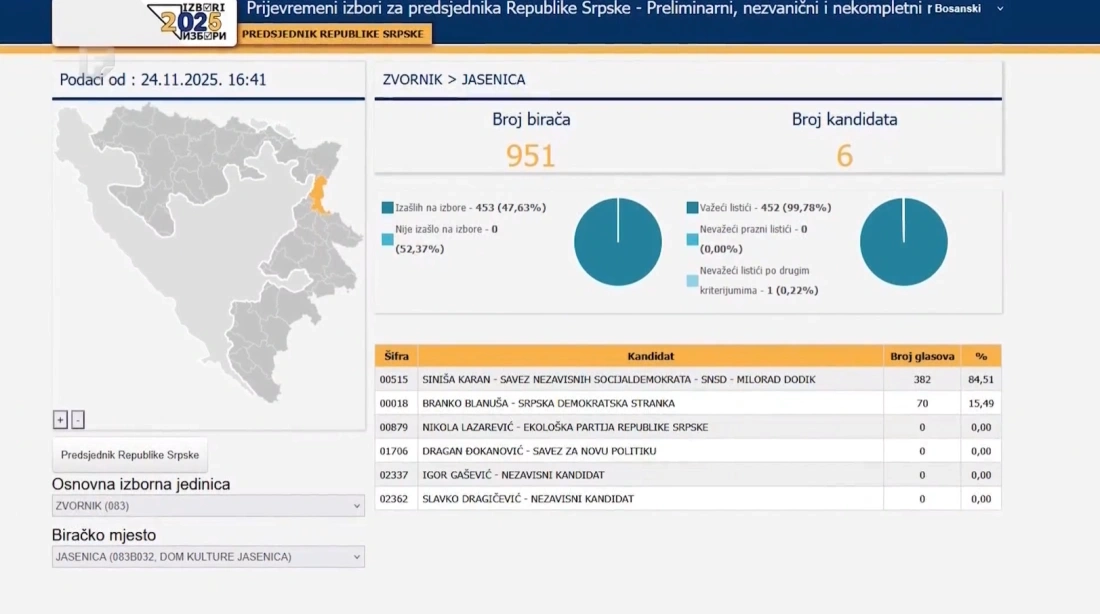 Ako do sada niste čuli za Snagovo, Jasenicu ili Pađine – mjesne zajednice koje pripadaju gradu Zvorniku, od danas ćete znati za njih. Izborni fenomeni na biračkim mjestima dali su više od 90 procenata svojih glasova Siniši Karanu, kandidatu vladajuće koalicije za predsjednika Republike Srpske. Razlika u Zvorniku u korist Karana od 6.000 glasova, u Doboju 4.000 ili u Laktašima 5.000 bile su presudne za izbore. Opozicija sumnja ponovo u izbornu prevaru.