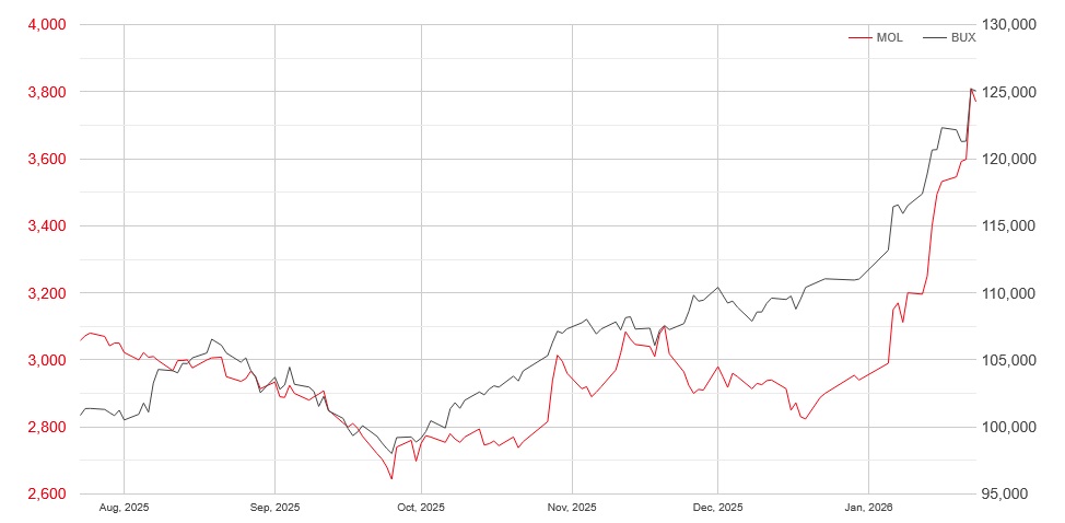 Ipak, od tada kreće novi snažni rast koji je dostigao vrhunac pomenutog 22. januara. U tom periodu skok vrijednosti dionice MOL-a bio je također impresivan – 34,9%. (U petak je pala na 3.770 forinti).
