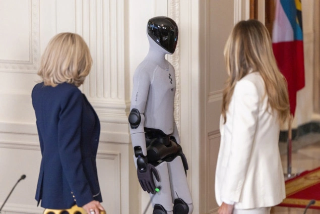 Melania Trump i humanoid su polako hodali jedan pored drugog crvenim tepihom. Prva dama je zastala neposredno prije ulaska u Istočnu sobu dok je robot obišao sto sa panelistima i zauzeo poziciju u centru prostorije. Bio mu je potreban trenutak da skenira publiku prije nego što je progovorio.